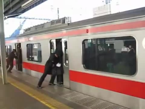 People stuffed onto a train in Tokyo, Japan (train stuffing Tokyo)